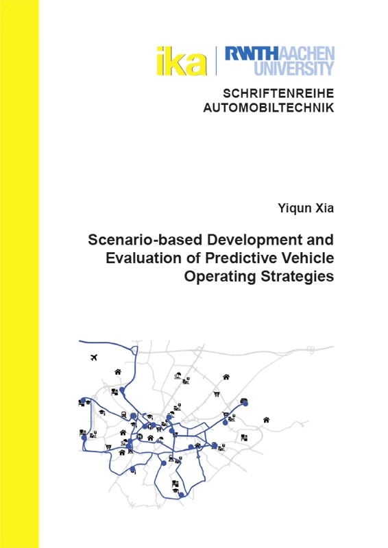 Die Automobilindustrie und Regierungen weltweit setzen diverse Strategien ein, um strengere Energie- und Emissionsvorschriften im Verkehrssektor zu erfüllen. Vorausschauende Fahrzeugbetriebsstrategien, die ein erhebliches Potenzial zur Steigerung der Energieeffizienz bieten, sollten entwickelt und durch virtuelle Testfahrten ausgewertet werden, bevor sie in die Serienproduktion gehen. Diese Arbeit präsentiert einen szenariobasierten Ansatz zur Entwicklung und Auswertung vorausschauender Fahrzeugbetriebsstrategien in realistischen Fahrszenarien während der frühen Entwicklungsphase mittels Simulation. Der Ansatz ist an das 6-Layer-Model (6LM) angepasst, das zur Validierung des automatisierten Fahrens verwendet wird, um verschiedene Umweltbedingungen objektiv zu beschreiben. Es wird untersucht, wie Szenarien effektiv genutzt und auf vorausschauende Fahrzeugbetriebsstrategien angewendet werden können. Ein spezifischer Anwendungsfall für Robotertaxis in Aachen wurde untersucht. Anstatt eines festen Fahrzyklus wurden stochastische, zeitbasierte Taxifahrten über einen Betriebszeitraum von 365 Tagen definiert, unter Berücksichtigung vordefinierter Zonenkategorien und Points of Interest (POIs). Der szenariobasierte Ansatz wurde in MATLAB/Simulink und Vissim umgesetzt. Ein dreistufiges Kalibrierungs- und Validierungsverfahren wurde angewendet, um die Simulationsgenauigkeit zu gewährleisten, indem Verkehrsbedingungen und Fahrzeugtrajektorien aus makroskopischer, mikroskopischer und submikroskopischer Perspektive anhand von Felddaten aus verschiedenen Quellen analysiert wurden. Nach der Kalibrierung und Validierung wurden langfristige und kurzfristige Verkehrsvorhersagemethoden entwickelt, um die notwendigen Eingaben für zwei repräsentative vorausschauende Betriebsstrategien bereitzustellen. Eine Eco-Routing-Strategie zur Reduktion des Energiebedarfs durch optimierte Routenwahl und eine vorausschauende Energiemanagementstrategie (EMS) für Plug-in-Hybridfahrzeuge zur Optimierung der Leistungsverteilung. Die Ergebnisse zeigen, dass der szenariobasierte Ansatz die Variabilität realer Fahrbedingungen effektiver erfasst als feste Fahrzyklen. Beide Strategien wiesen auf Grundlage der angegebenen Szenarien bemerkenswerte Energieeinsparungsvorteile gegenüber Stand der Technik auf. Zukünftige Forschungen könnten Eco-Routing und vorausschauende EMS weiter verfeinern und gleichzeitig breitere Anwendungen des szenariobasierten Ansatzes untersuchen, um die Optimierung und Bewertung der Energieeffizienz von Fahrzeugen weiter zu verbessern.