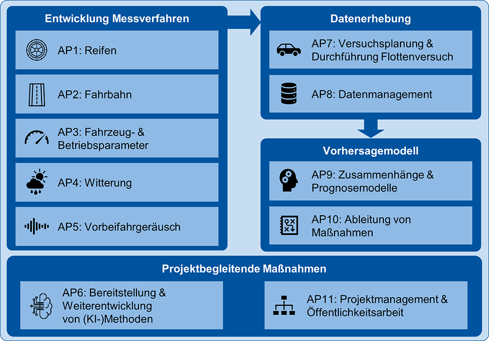 Straßenverkehrslärm beeinträchtigt die Lebensqualität vieler Bürger. Dieser entsteht insbesondere bei E-Fahrzeugen vor allem durch den Reifen-Fahrbahn-Kontakt. Bei der schrittweisen Senkung der Grenzwerte des Fahrzeug-Außengeräuschs ist somit auch eine Reduktion der Reifen-Fahrbahn-Geräuschemissionen (RFGE) notwendig. Für die Entwicklung und Validierung von Minderungsmaßnahmen der RFGE sind umfassende Messdaten notwendig, die im Rahmen dieses Projekts erfasst werden sollen. Darauf aufbauend wird eine Datenbasis für RFGE und deren Einflussgrößen im realen Straßenverkehr erstellt und ein Vorhersagemodell mittels KI-Methoden abgeleitet, das die Lücke zwischen vorhandenen physikalischen Modellen und der Realität schließt. Das Modell soll es erlauben, aus einer geeigneten Messung auf einer bestimmten Fahrbahn, auf die Emission auf anderen Strecken zu schließen sowie Minderungsmaßnahmen abzuleiten.